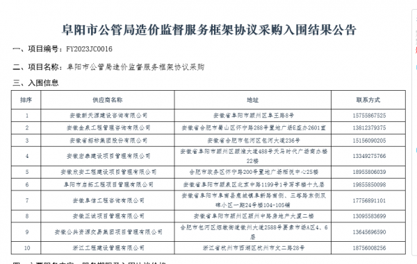 2023年5月5日我公司(阜陽市啟拓工程項目管理有限公司)在阜陽市公管局造價監督服務框架協議采購框架協議項目中,憑借扎實高效的工作作風,卓越的運作團隊和良好的企業信譽,以絕對優勢順利中標。